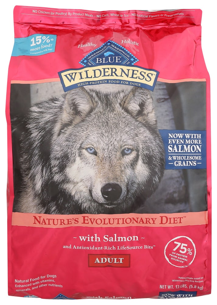 Satisfy the spirit of the wolf with meat-rich BLUE Wilderness. This high-protein recipe contains more of the delicious deboned chicken your dog loves, plus wholesome grains like oats, barley, and brown rice for healthy complex carbohydrates.