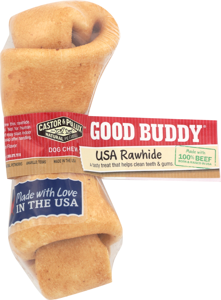 Made from 100% USA beef and basted in a natural chicken flavor, our rawhide provides a delicious way to help keep your dog’s teeth and gums clean. Rawhide is also a great solution for aggressive chewers, or puppies that are inclined to chew on shoes, furniture, or anything they can find. Plus, they make great fetch toys! Many rawhides are sourced in the USA, but processed overseas. All of our rawhide is made in the USA from start to finish. That’s our rawhide guarantee! Comes in a 8-9″ and 10-11″ Rawhide Bone.