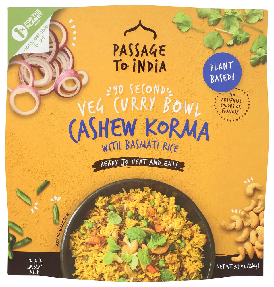Passage to India Butter Masala 90-Second Veg Curry bowl touts all of the flavor of traditional butter chicken, replacing the chicken with delicious and nutritious vegetables and also including French and Red kidney beans. Topped off with the crunchiness of fried onions and basmati rice.